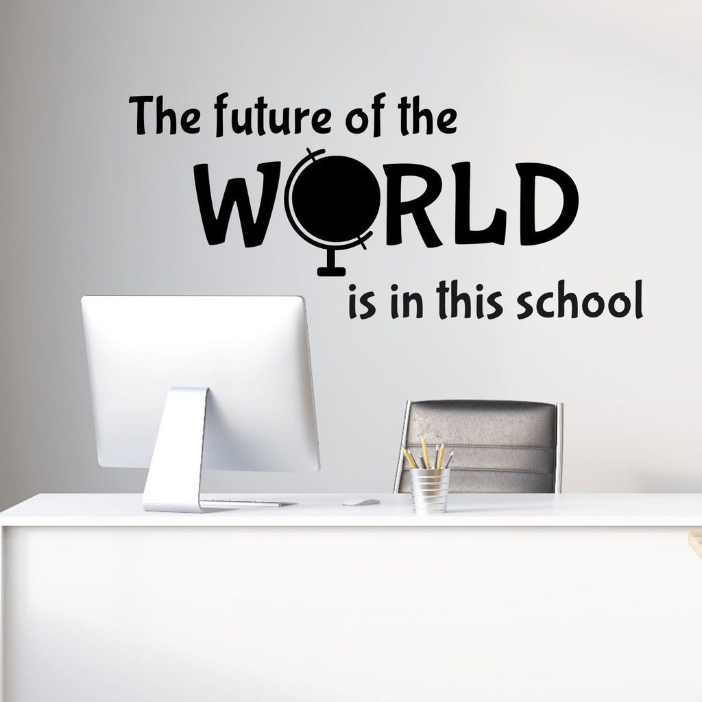 School staff and parents will adore this inspirational decal with the quote, “The Future of the World is in This School”, with “world” emphasized by a globe graphic. Completely removable, the decal comes in over 30 colors and various sizes, and can be used on a wall, chalkboard and windows. Being die cut, it will look like it is hand painted on, in a glare-less matte finish.