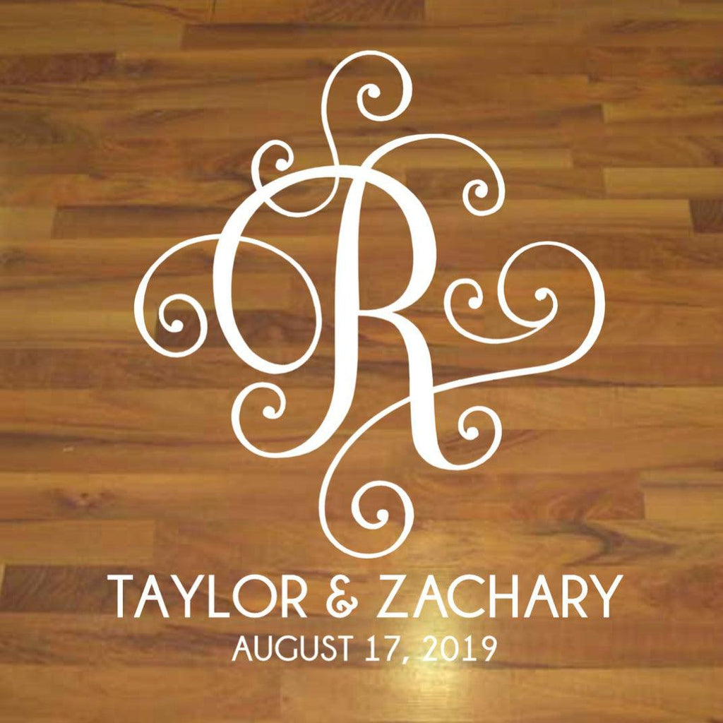 So stylish for your wedding dance floor, the aisle, the wall behind the head table and more, this vinyl decal features a beautiful scrolled initial of your last name and your wedding date. It comes in your choice of over 30 colors, including metallics, making it easy to match your wedding scheme, as well as various sizes in a glare-less matte finish. Being a die cut, the decal will look like it is hand painted on to the floor, wall, windows or any other smooth surface.