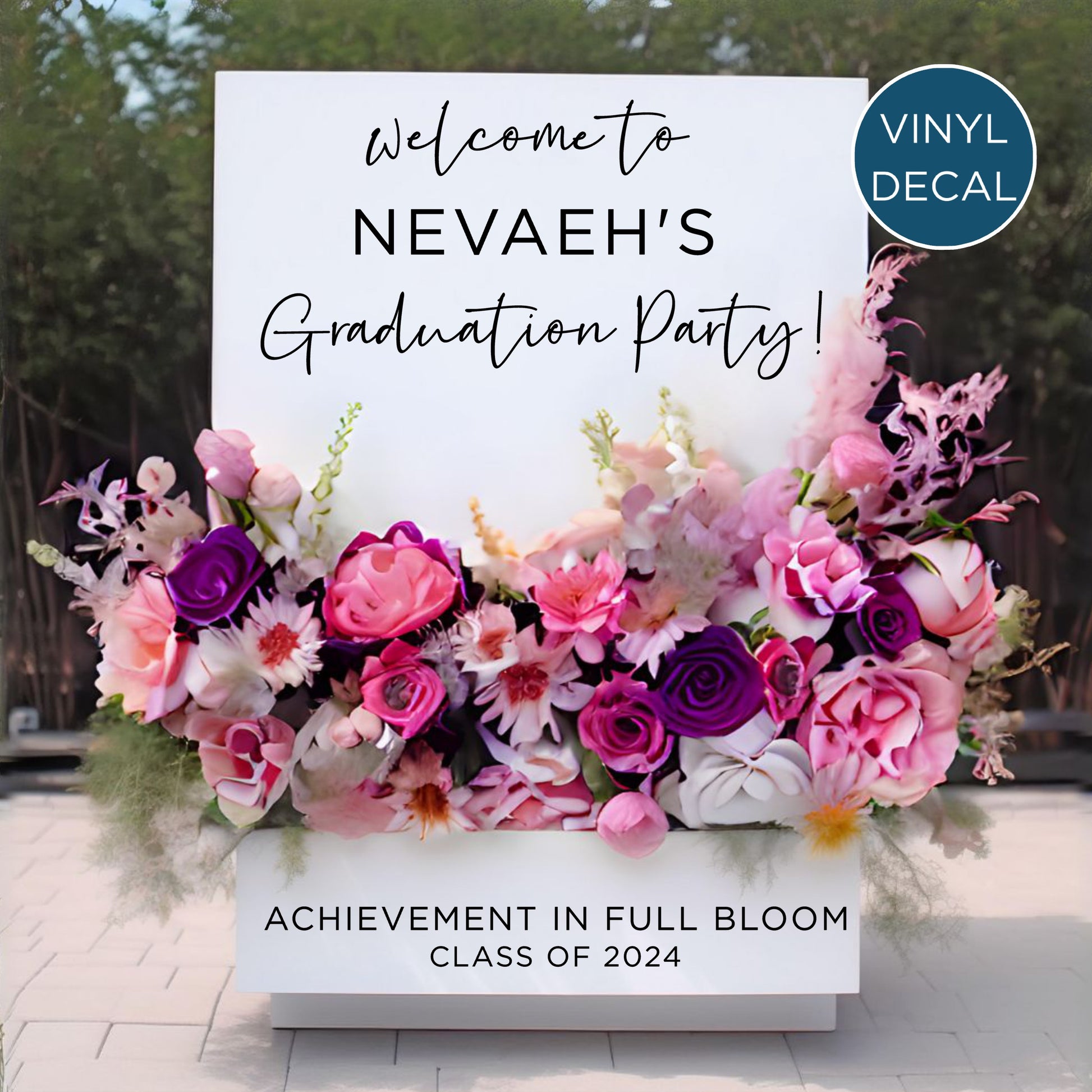 Add a personalized flourish to your graduation festivities with our DIY Flower Box Vinyl Decal. Designed for the creative spirit, this decal elegantly spells out "Welcome to [Name's] Graduation Party!" with an accompanying "Achievement in Full Bloom" to honor your graduate’s achievements. It’s the perfect match for a flower box sign, creating a professional-looking welcome that’s steeped in personal significance.