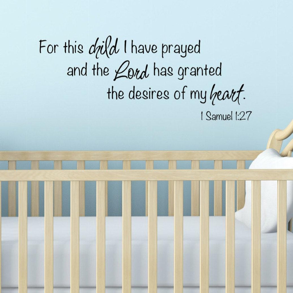 Read moreThis beautiful Bible scripture, 1 samuel 1:27, reads “For this child I have prayed and the lord has granted the desires of my heart.” We offer over 30 colors to choose from! Perfect as unisex nursery decor, this gorgeous vinyl wall sticker is a baby shower gift your loved one will cherish for years to come.