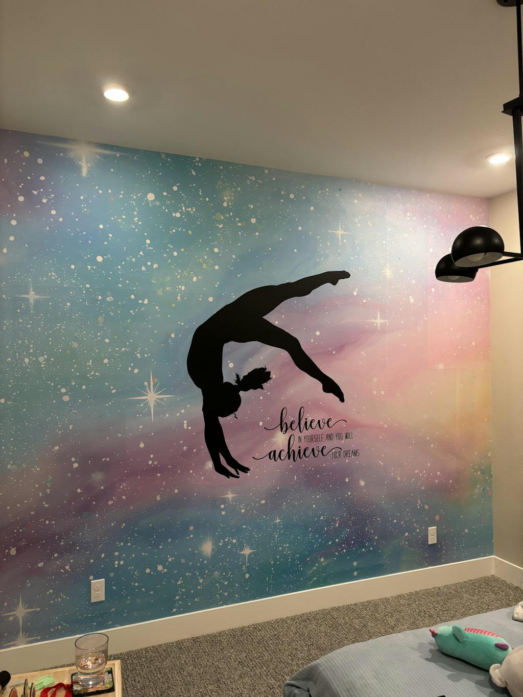 Read moreThis vinyl sticker showcases a gymnast as she completes a perfect backflip along with fun cursive font that reads “Believe in Yourself and You Will Achieve Your Dreams”. Turn this uplifting art piece into the perfect gift for a gymnast you love by choosing from over 30 colors to customize it. Keep the inspiration alive with this motivational wall art decal!