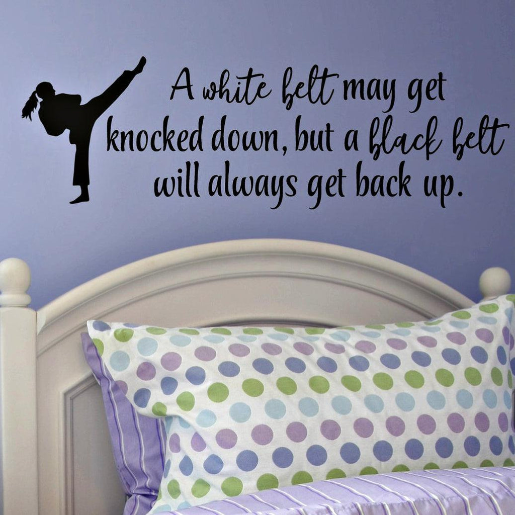 Read moreA silhouette of a strong girl practicing her karate high kick gives way to the hard hitting motivational quote “A white belt may get knocked down, but a black belt will always get back up.” We offer over 30 colors to customize this wall sticker so you can create a thoughtful gift that’s sure to motivate your karate kid for years to come.
