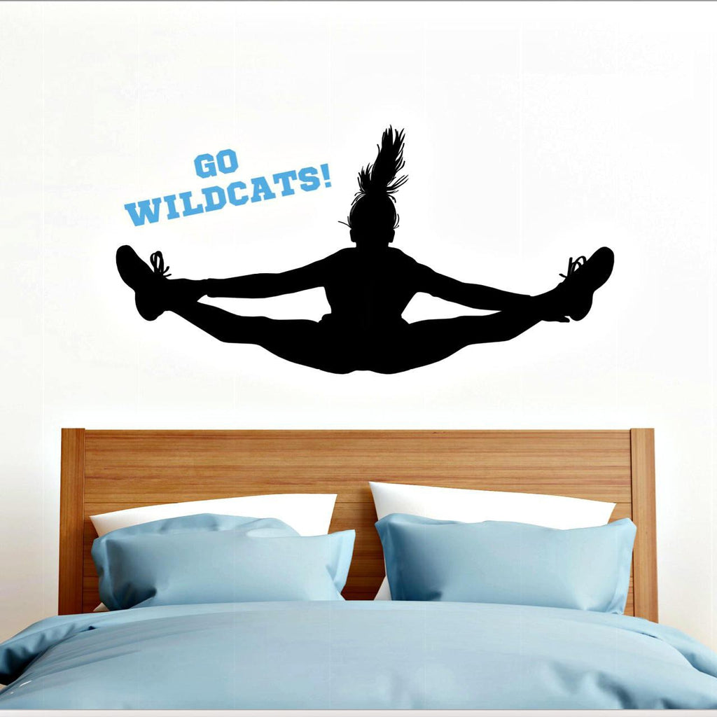 Read moreThis sports silhouette showcases a cheerleader performing a perfect toe touch. Create a school spirit gift with custom text for your spirit leader’s school team name. We offer over 30 colors to choose from so you can create fun custom gift. Whether she started tumbling as a toddler or she picked up her pom poms in high school, she’ll love this cheerleader wall sticker.