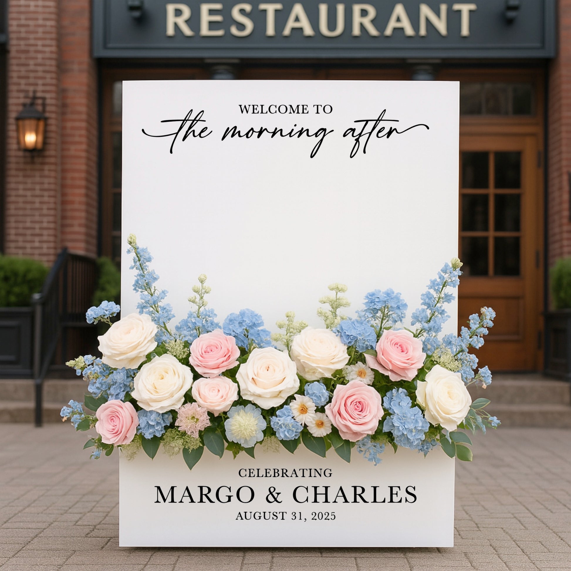 Keep the celebration going with our “Welcome to the Morning After” vinyl decal – perfect for the morning-after wedding brunch! This stylish decal adds a personal touch to your post-wedding gathering and makes a stunning focal point for photos, whether placed on a sign, mirror, or display board.