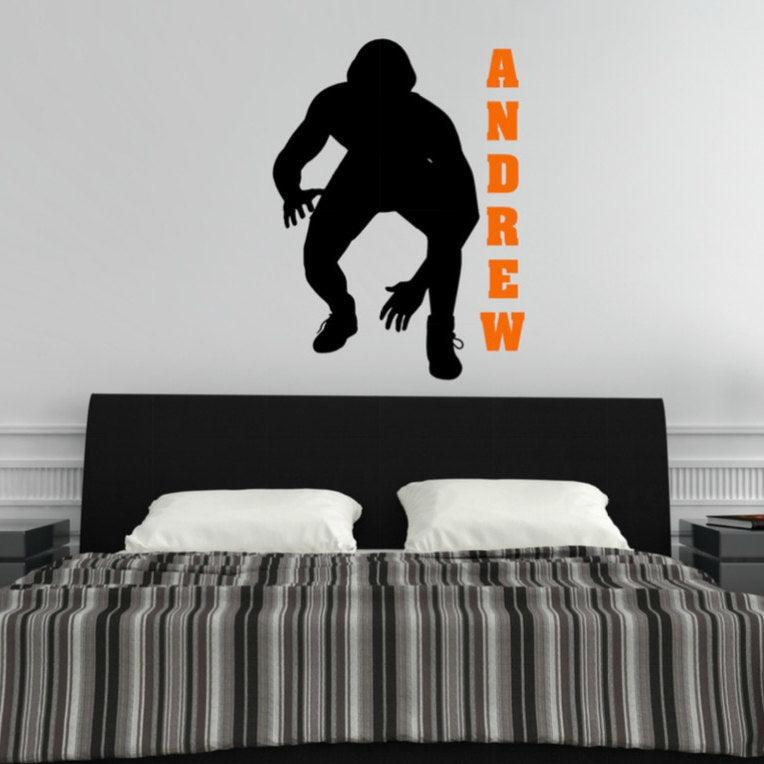 Read moreThis sports silhouette wall sticker features a wrestler hunched down ready to spring into action. Beside the wrestler a name of your choice is displayed. Both the wrestler and the text can be custom made in your choice of over 30 colors. Surprise your favorite grappler with this awesome wrestler decal in his school colors!