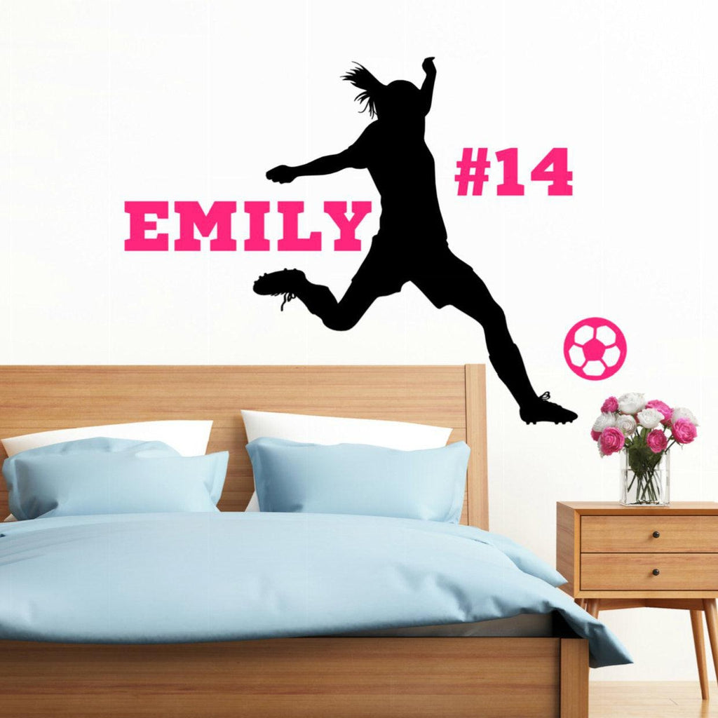 Read moreThis sports themed wall decal showcases a silhouette of female soccer player in “beast mode” along with a name and number that can be personalized. We offer over 30 colors for you to choose from, you can customize the text and silhouette to create a perfect match for your room decor. Surprise a fierce gal in your life with this personalized soccer wall decal.