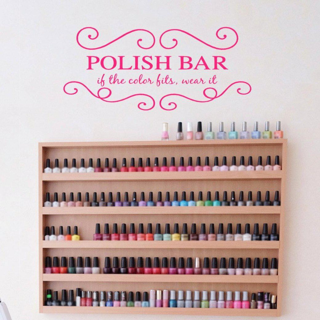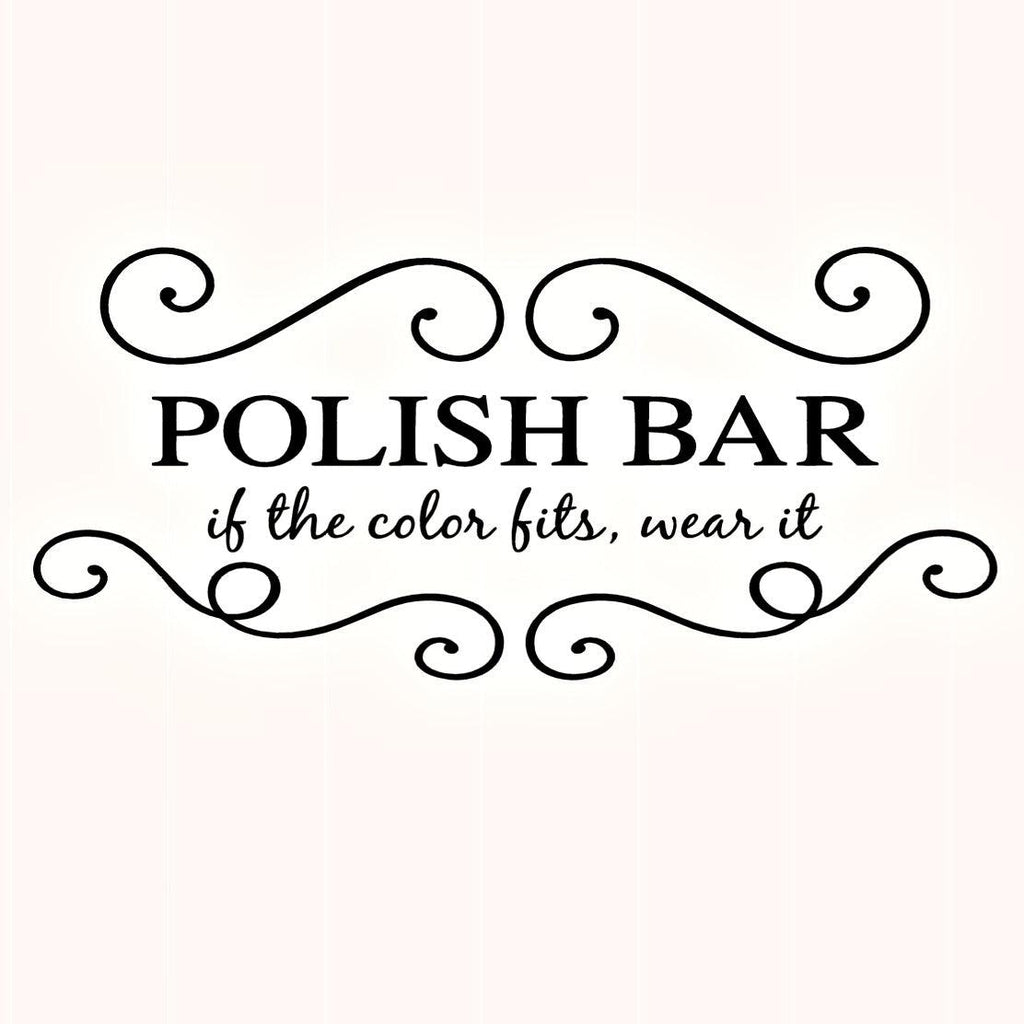 Read moreThis elegant yet fun vinyl sign reads, “If the color fits, wear it” just below the title Polish Bar. Simple, chic lines curl gracefully above and below the sign. With over 30 colors to choose from you’re certain to find the right fit for you spa or nail salon. Inspire your clients to go wild with color with this custom vinyl wall sticker.