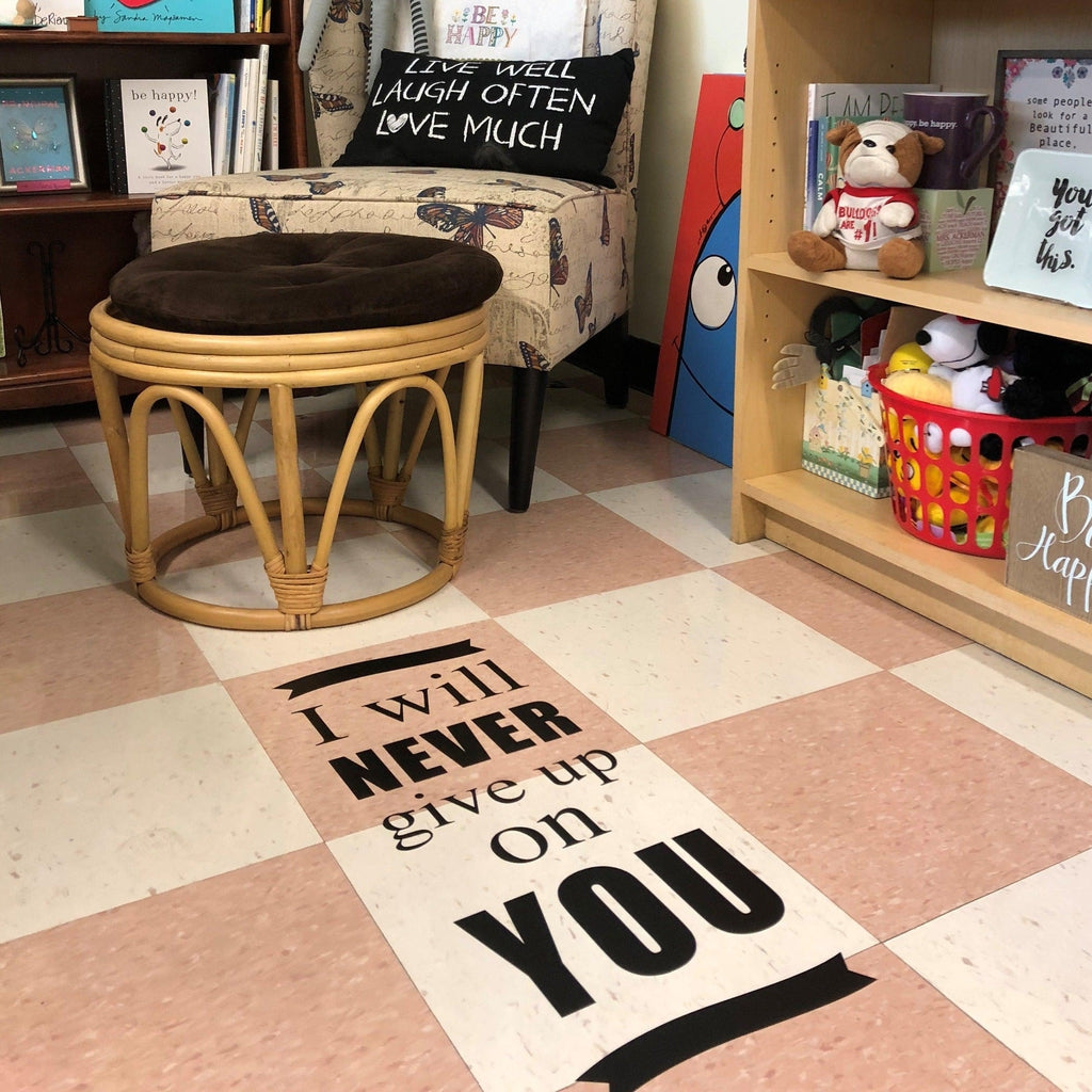 Read moreLift the people in your life up with an inspiring vinyl decal that reads “I will never give up on you”. This beautiful quote is available in over 30 colors so you can match your classroom, living room, or office decor. Giving up isn’t an option! Persevere with this die cut vinyl wall decal.