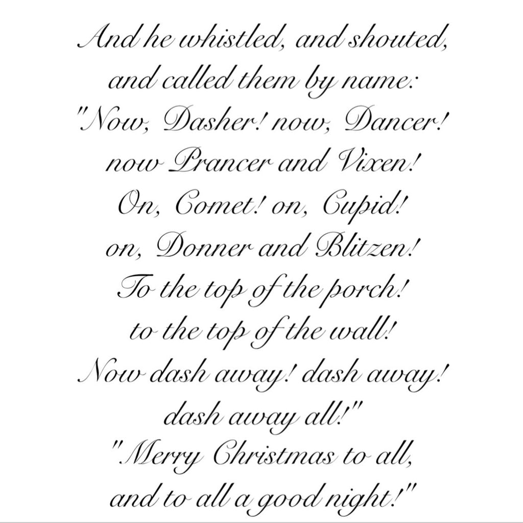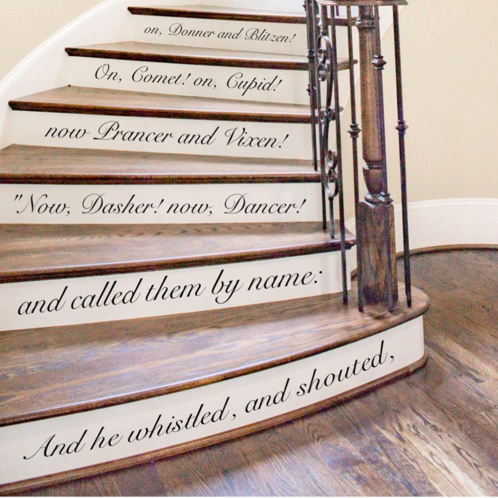 Now Dasher! now, Dancer! now, Prancer and Vixen! On, Comet! On, Cupid! on, on Donner and Blitzen! Done in a classic calligraphy script, bring one of the most popular Christmas poems ever to life on your holiday staircase with these vinyl decals. Completely removable (but not reusable) these high-quality stair riser stickers come in your choice of over 30 colors to easily coordinate with your holiday décor. Your holiday photos taken on the staircase will be extra wonderful!